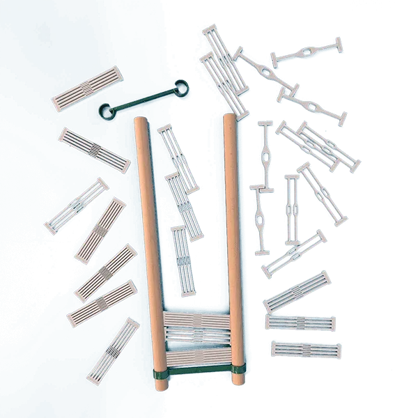 Les segments de peignes modulaires Lojan offrent une flexibilité maximale pour le tissage en grille rigide. Disponibles par lots de 5 segments (équivalent à 10 cm de largeur de tissage), ils permettent de créer un deuxième peigne ou de combiner différents espacements – idéal pour combiner différents poids de fil ou motifs dans un même projet. Vous pouvez ainsi créer facilement des structures de tissage personnalisées.